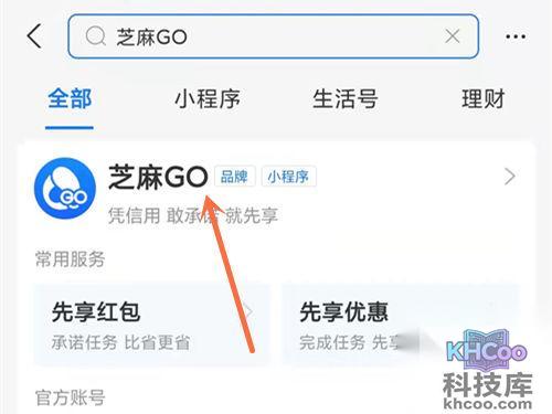 1、打开 支付 宝,在首页 搜索 芝麻GO 进入。