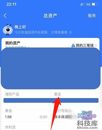 2、该页面可查看到自己的资产信息,点击基金进入;